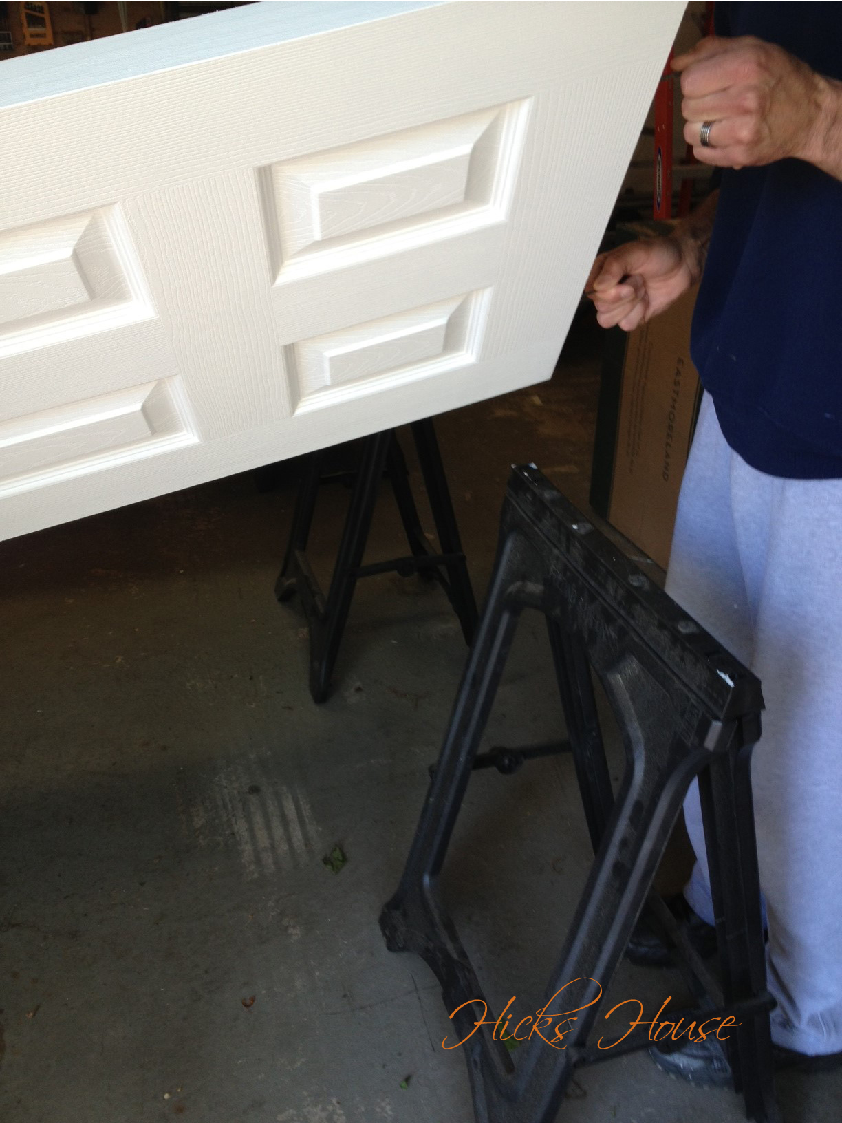Step 2 – Paint the door. We used Beher Ultra Premium Ultra Pure White Trim and Door paint in Eggshell and rolled all the flat parts of the door then did the panel cut outs with a brush making sure to get the corners real good.