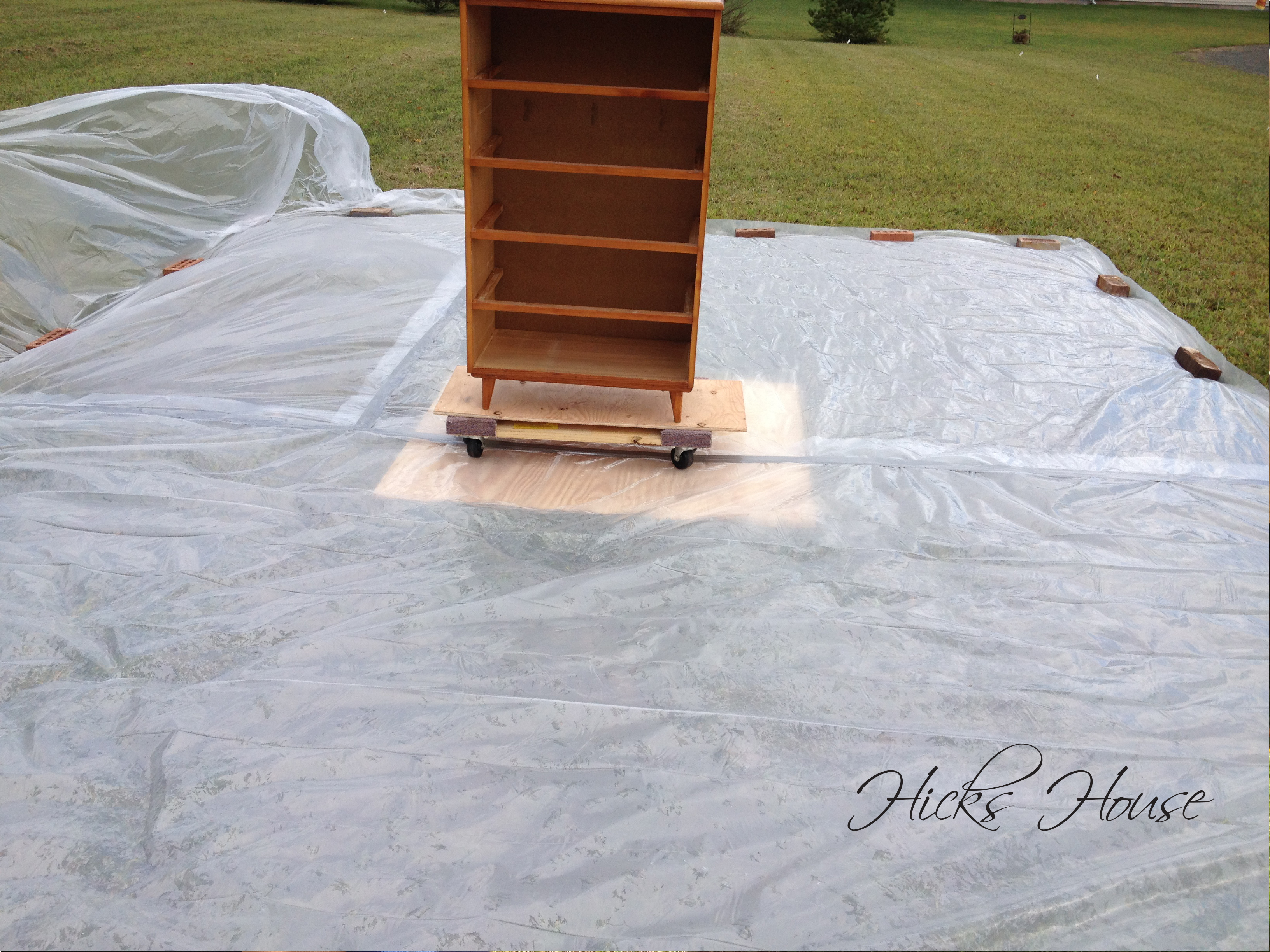 Then we created the “paint studio” out in the middle of the yard to ensure we didn’t get stray paint on anything. We tarped a large section, held it down with bricks then tarped over a moving dolly that we put the dresser on. The purpose of this was so that we could easily spin the dresser so as not to spray directly into the wind. I apparently missed that memo as I was in the zone and ended up covered in blown back paint. C’est la vie.