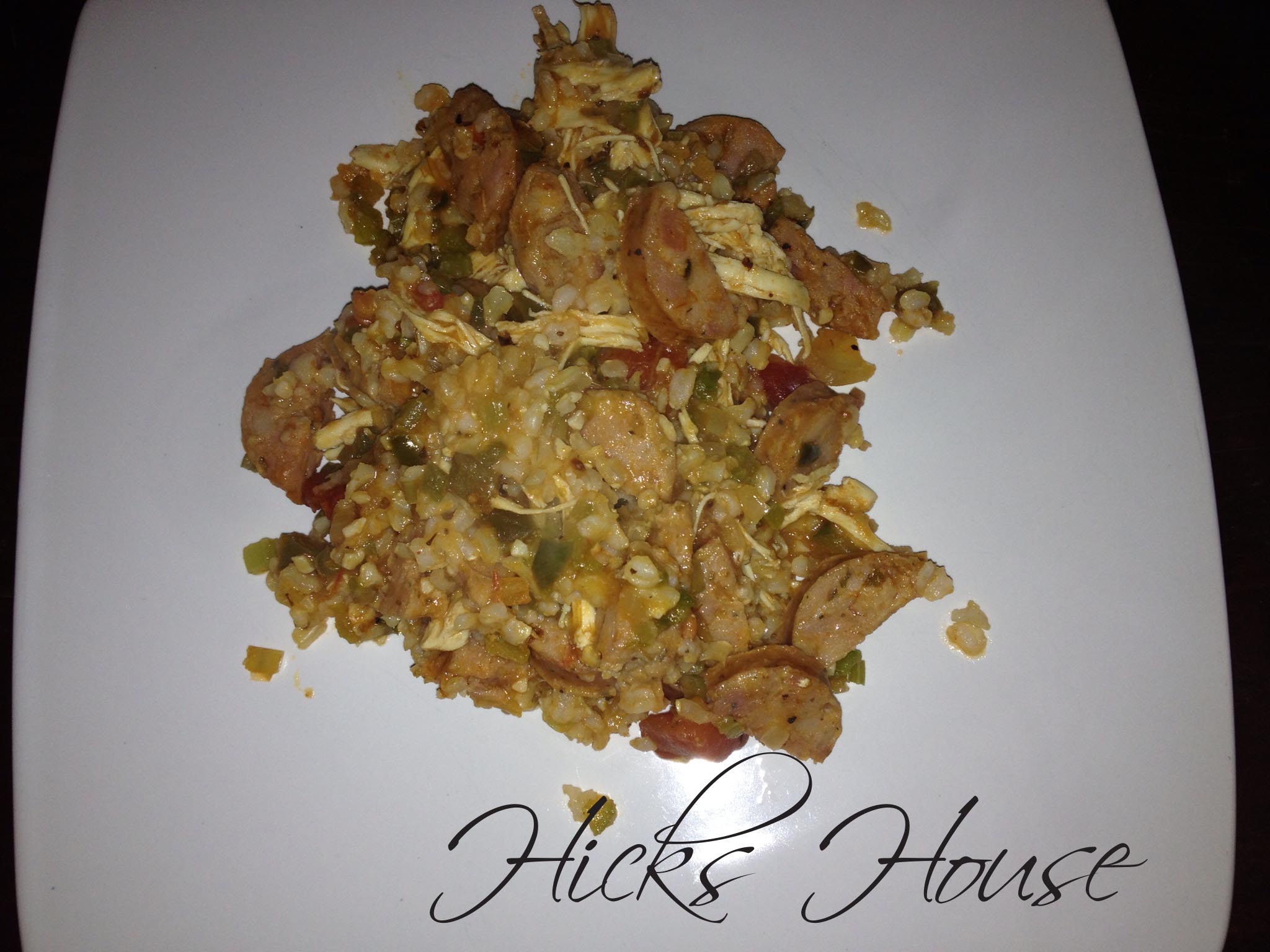 Thinking of sausage and chicken together immediately had me thinking of jambalaya. I looked up a couple of recipes and they all had the entire process taking an hour plus. Not gonna happen on a Monday hunny. So we made it up as we went along and were pleasantly surprised – I thought it tasted just like jambalaya I’d had out that had been slow cooked.