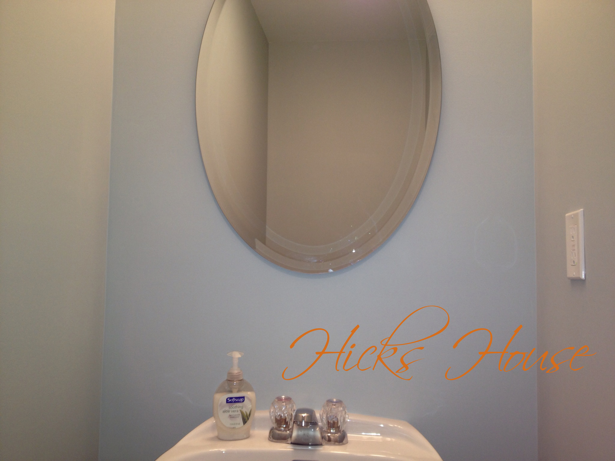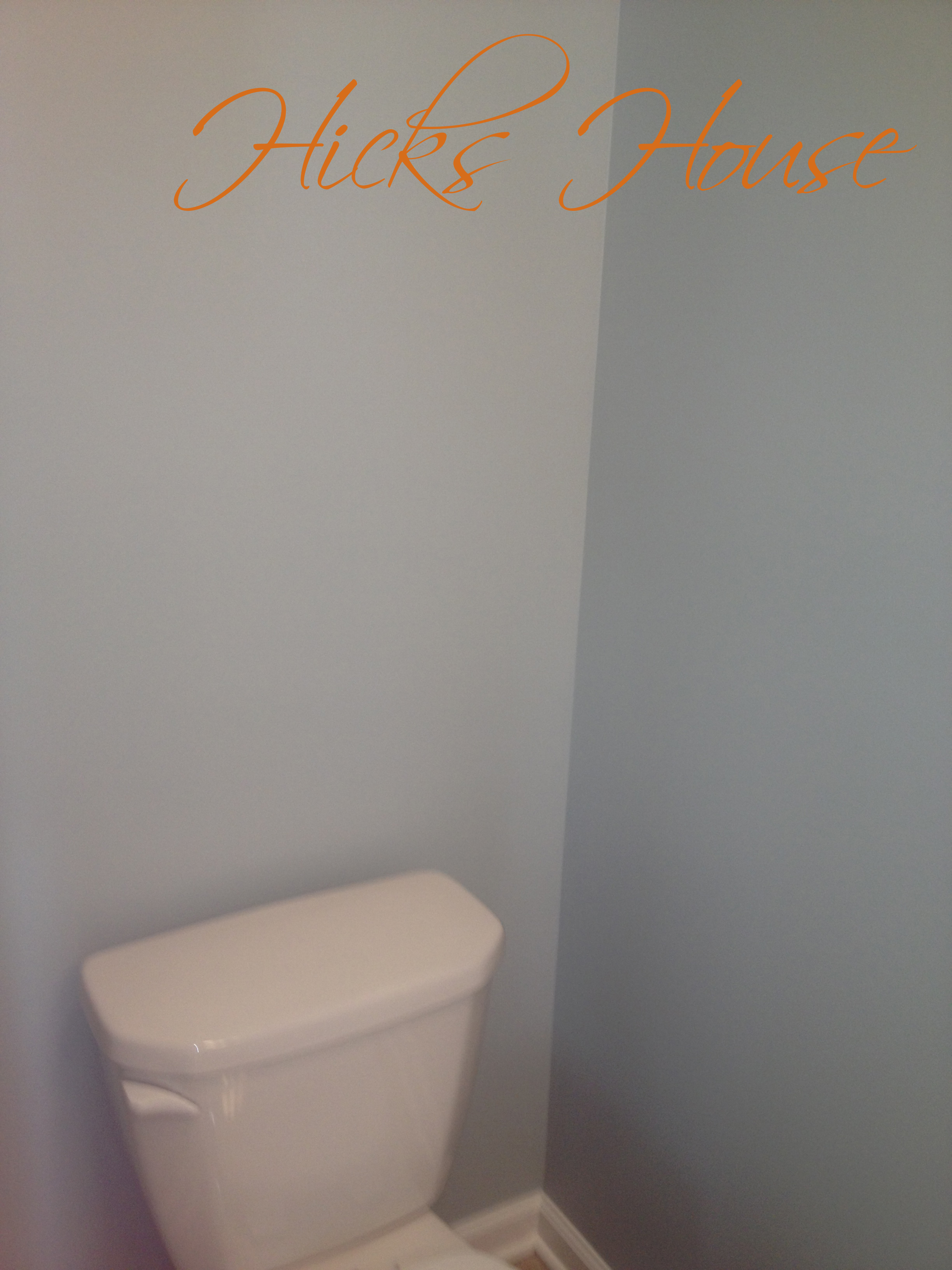 From the color chart you can see that we chose Woodlawn Blue for this room. So far of the rooms we’ve painted this is Ken’s favorite color. It’s a very soothing light blue that feels very “spa-like.” It didn’t photograph all too well (story of this blog – if you’re reading this I could use a new camera – that would be a nice gift…) mostly I think because the room is so small its hard to photograph especially since I didn’t want to be seen in the mirror reflection (I hate that). But here it is: