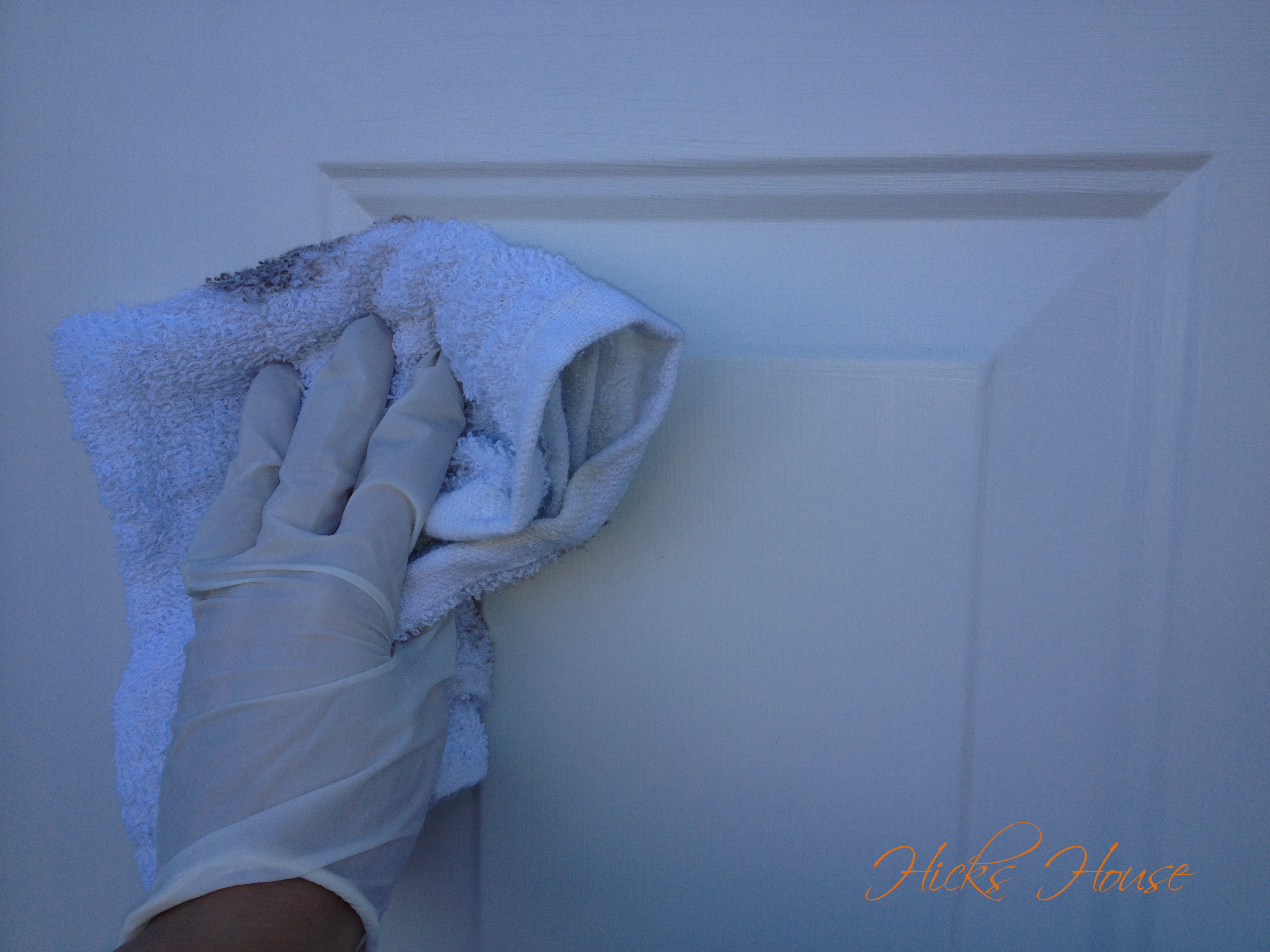 So I got to work cleaning the door with some mineral oil to get off any dirt and grime that was on it. (I read this is extremely important in order for the paint to adhere properly.) It turned out to be a LOT dirtier than I could have imagined.