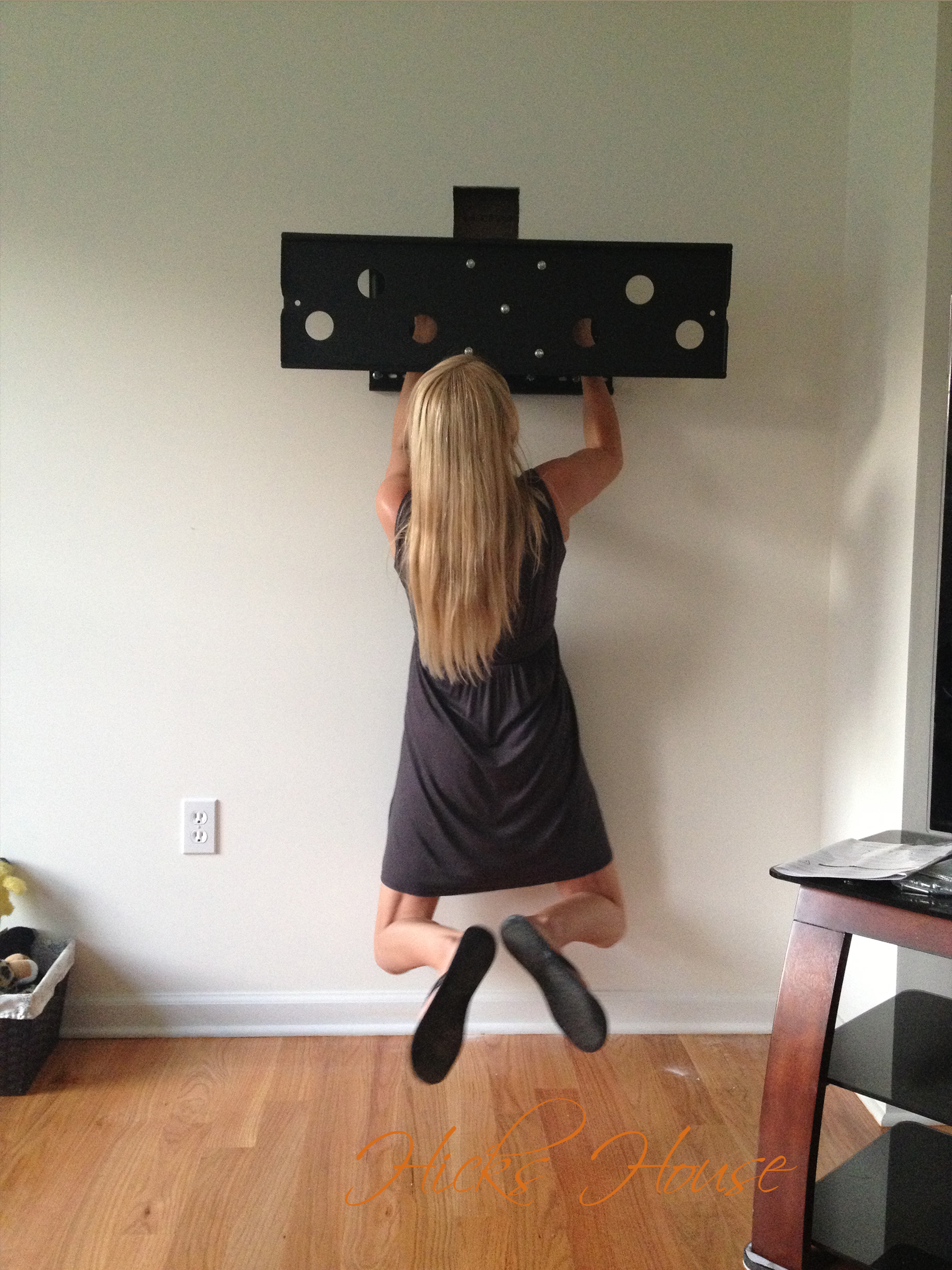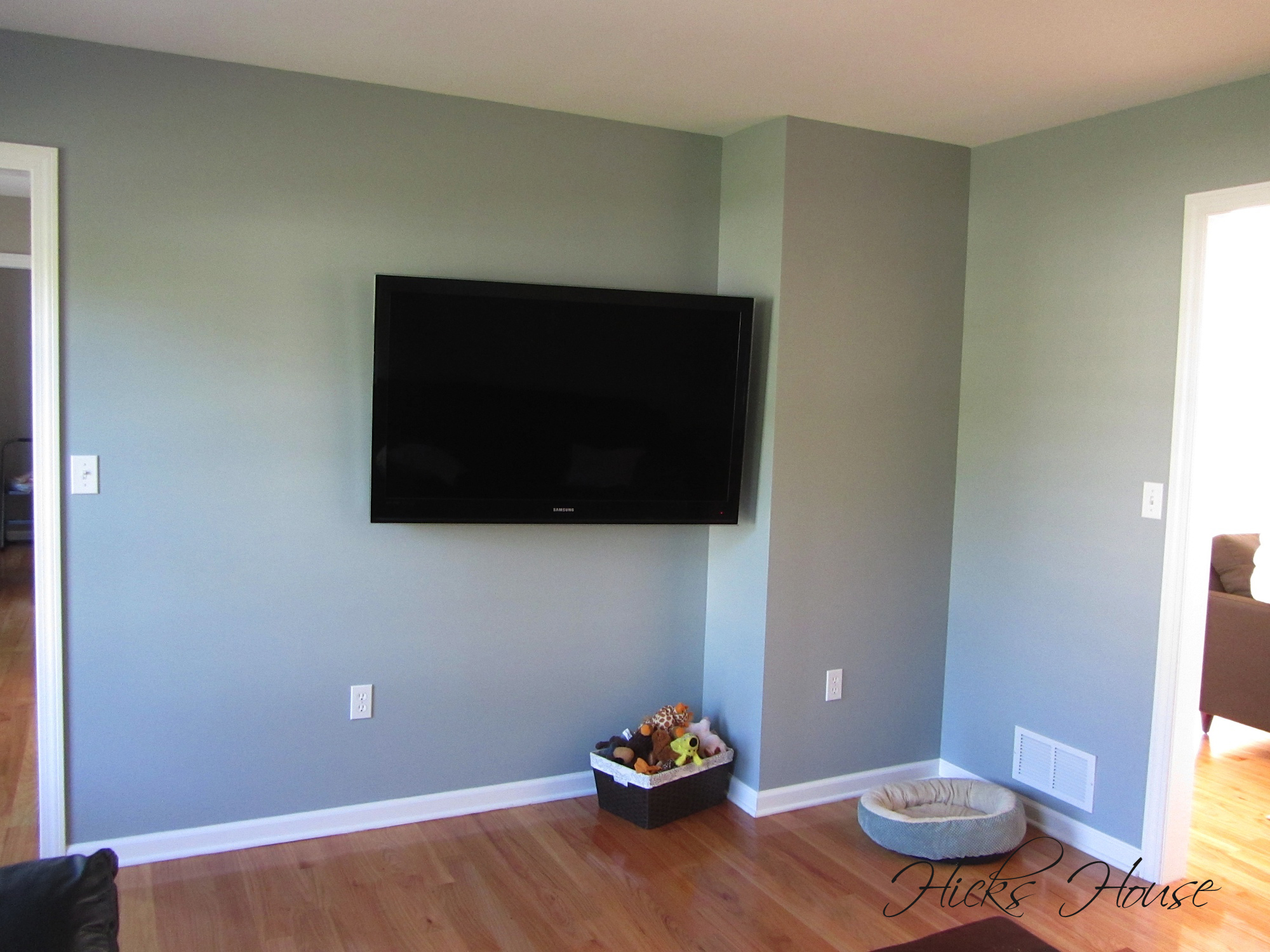 One of the best photos of me ever testing the weight limit of the TV mount. The photo also showcases the blase white walls that originally made up the entire house (we’re slowly chipping away at that.) You may also remember from this post that we had selceted Benjamin Moore’s Silver Mink for this room. It’s one of the darkest color choices we made for the entire house as this is the room where we relax and watch TV and we purposefully didn’t want it to be too light.